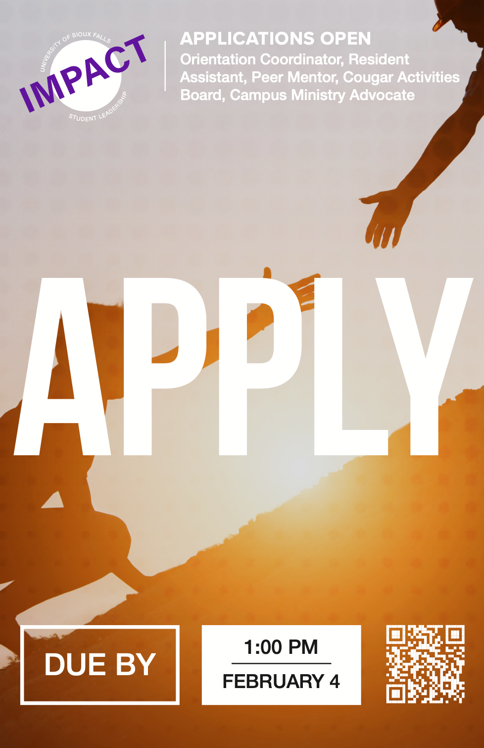 There are 2 different posters, Apply and Lead. Lead to create awareness of the informational meetings and Apply to remind students of the application deadline. With the goal of inspiring students to lead, I sourced photos that felt impactful in an active “get out there” manner. The series was designed with consistent large one-word call-to-actions, the IMPACT mark, and rectangular displays for information callouts.