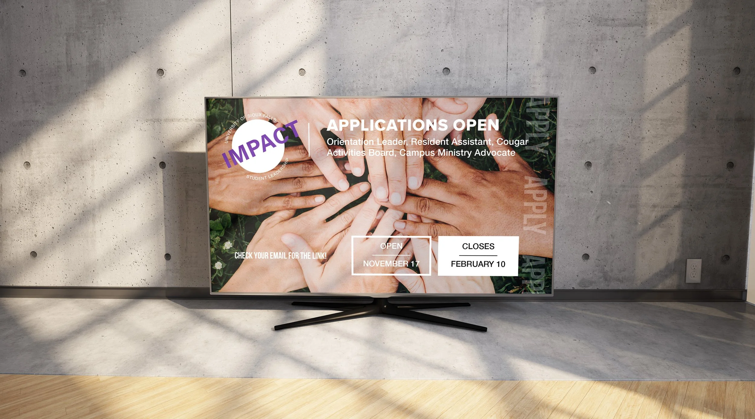 After conceptualizing and finalizing a mark to represent IMPACT universally, we moved forward with creating a cohesive series of posters and TV Graphics to be displayed around campus.